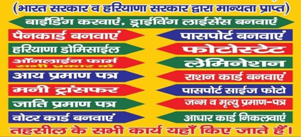 1 पासपोर्ट Rs. 1650/- , 2 आधार कार्ड Rs. 50/-, 3 पैन कार्ड Rs. 160/-, 4 पेंशन सर्विस Rs. 50/-,5 जन्म प्रमाण पत्र Rs. 50/-,6 मृत्यु प्रमाण पत्र Rs. 50/-, 7 जाति प्रमाण पत्र Rs. 30/-, 8 निवास प्रमाण पत्र Rs. 30/-, 9 आय प्रमाण पत्र Rs. 30/-, 10 बिजली बिल ,11 राशन कार्ड,12  पुलिस वेरिफिकेशन, 13  PAN CARD, 14  PM किसान ,15 परिवार पहचान पत्र ,16  मेरी फसल मेरा ब्यौरा,17 EWS सर्टिफिकेट ,18 बेरोजगारी भत्ता पंजीकरण ,19 सक्षम योजना पंजीकरण,20  आयुष्मान कॉर्ड,21 फॅमिली आईडी में करेक्शन,22 नया राशन कार्ड बनवाना व उसमें सदस्य का नाम चढ़ाना,23 नया बिजली कनेक्सन ,24 वोटर कार्ड ,25 पासपोर्ट ,26 वाहन बीमा ,27 ऑलाइन फॉर्म,..8901010994,8054061994,
